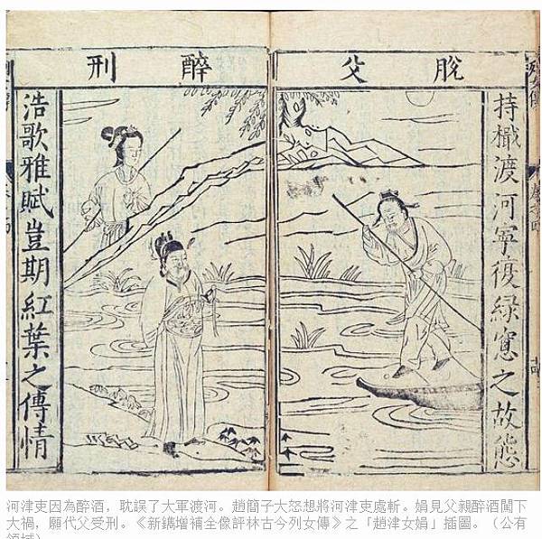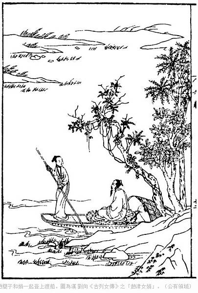 趙簡子和娟一起登上渡船。圖為漢 劉向《古列女傳》之「趙津女娟」。(公有領域)