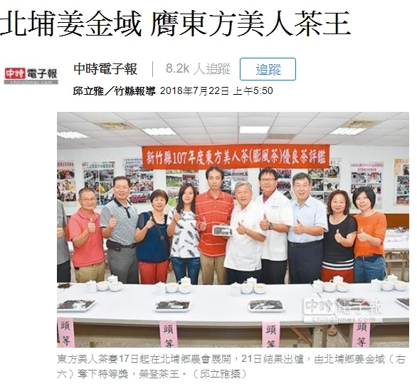 東方美人茶賽17日起在北埔鄉農會展開,今年共有1115點參賽,是近3年來點數最多一次。為杜絕人為抽樣或茶樣混充,影響比賽結果,特別以裸茶方式抽取茶樣進行評鑑,並採用QRcode讓消費者追溯生產履歷。21日結果出爐,由北埔鄉姜金域奪下特等獎,榮登茶王。