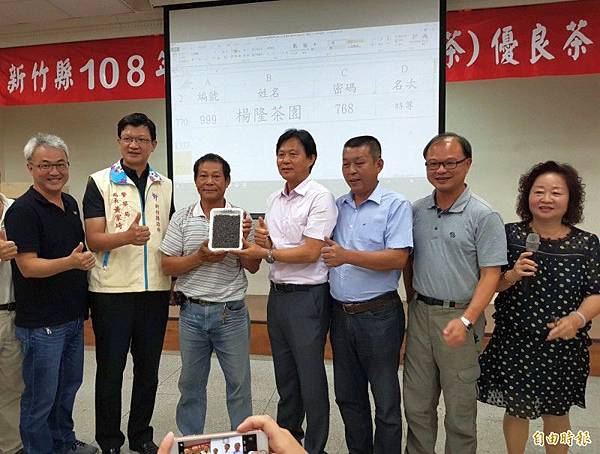 新竹縣東方美人茶優良茶比賽成績今天中午揭曉,資深茶農楊瑞隆(左三)奪得特等獎。(記者蔡孟尚攝)