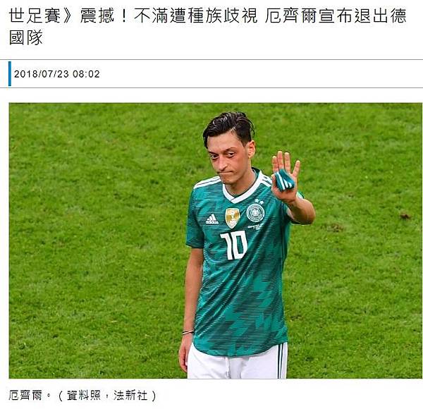 〔體育中心/綜合報導〕德國隊在本屆世界盃失利,陣中土耳其裔大將厄齊爾(Mesut Ozil)不僅賽會發揮不佳,在陣前和土耳其總統合照的舉動,更成為德國人眾矢之的。他在昨晚終於打破沉默、發表3篇沉重聲明,表示因為受到種族歧視,他心灰意冷,決定退出德國國家隊。「在他們眼中,贏了,我就是德國人,輸了,我就是移民。」