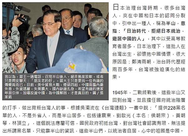 但是,經過70年後,國共兩黨分據兩地,建立兩國,這是事實,但是,老舊的憲法,錯亂的教育,使更多的台灣人,陷入「兩個祖國」的爭端,一堆台灣人往來兩國,或旅行或營生,敵友不分,半山文化依舊未減。