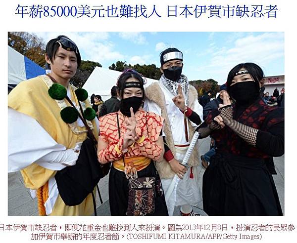 日本伊賀市缺忍者,即便花重金也難找到人來扮演。圖為2013年12月8日,扮演忍者的民眾參加伊賀市舉辦的年度忍者節。(TOSHIFUMI KITAMURA/AFP/Getty Images)