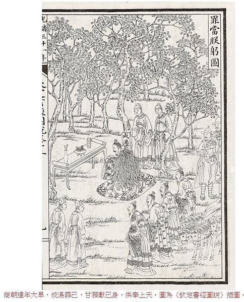 商朝連年大旱,成湯罪己,甘願獻己身,供奉上天。圖為《欽定書經圖說》插圖。(公有領域)