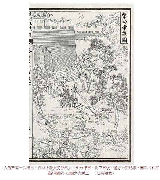 大禹王有一次出巡,在路上看見犯罪的人,即命停車。他下車後,傷心地哭起來。圖為《欽定書經圖說》插圖之大禹王。(公有領域)