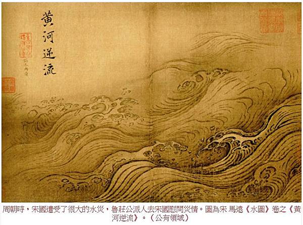 周朝時,宋國遭受了很大的水災,魯莊公派人去宋國慰問災情。圖為宋 馬遠《水圖》卷之《黃河逆流》。(公有領域)