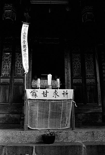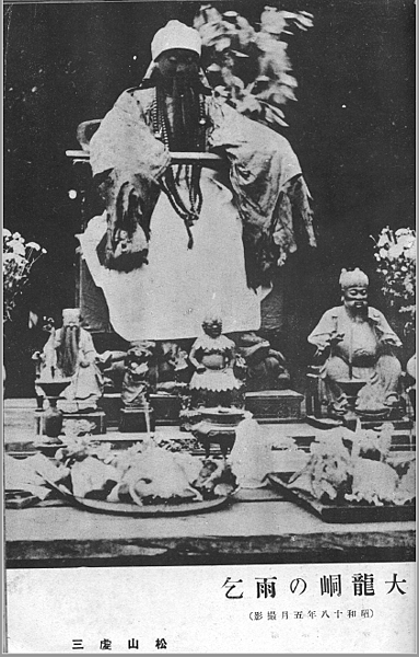 期盼降雨最常見的方式就是向上天祈雨囉!如何祈雨呢?在1943年出版的刊物《民俗臺灣》中〈大龍峒の雨乞〉一篇,有攝影師松山虔三記錄1943年5月中旬台北大龍峒保安宮祈雨的過程,是臺灣少數留下的日治時期傳統祈雨儀式的珍貴記錄。祈雨有特別的祭祀方式,除了設有神案外,另有掛著「商羊」的招幡,商羊為古代傳說中只有一隻腳的神獸,每逢大雨將至就會在宮中飛舞,因此有「商羊鼓舞」的典故。另設有一水缸,缸上貼有祈雨符,寫著:「五湖四海龍王五方祈雨龍神到此」。