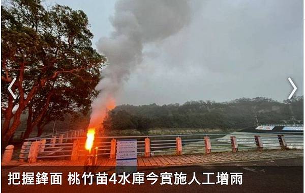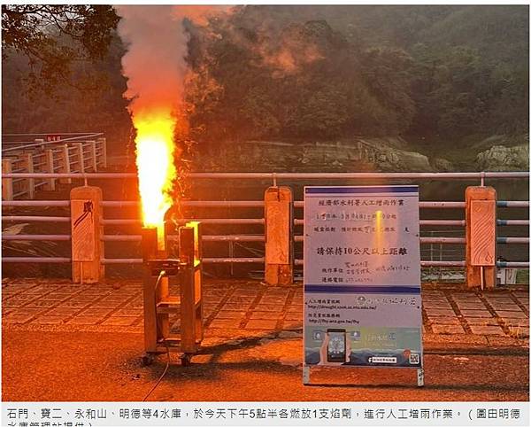經濟部水利署北區水資源局依據中央氣象局預測低氣壓滯留鋒面過境,請石門、寶二、永和山、明德等桃竹苗地區主要水庫,於今天下午5點半各燃放1支焰劑,進行人工增雨作業,盼為水庫帶來進帳。