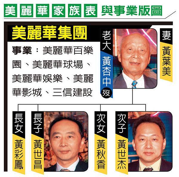 美麗華集團事業版圖有美麗華影城、美麗華百樂園、高爾夫球場、三信建設等,創辦人黃杏中於2015年去世,太太於2009年去世,2人育有4名子女。