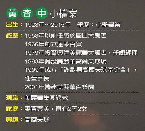 黃杏中是美麗華黃家十個兄弟姊妹中的老大,也是黃家發跡的主角,他因曾在圓山飯店工作,而涉入觀光旅遊業,把世代在大直務農的家族,帶入商場。