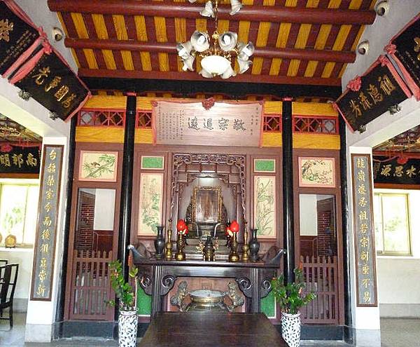 進入上廳即後堂,懸掛著楊纘緒及其夫人藍氏的遺像。古老的神座頂方木牌匾上書「咸慶堂」三個大字,遵勁蒼健;下款右書:「兵部尚書兼都察院右都御史總督閩浙等地方提督軍務糧餉眷弟鍾音頓首拜題」;左書:「乾隆三十八年癸巳仲冬谷立」
