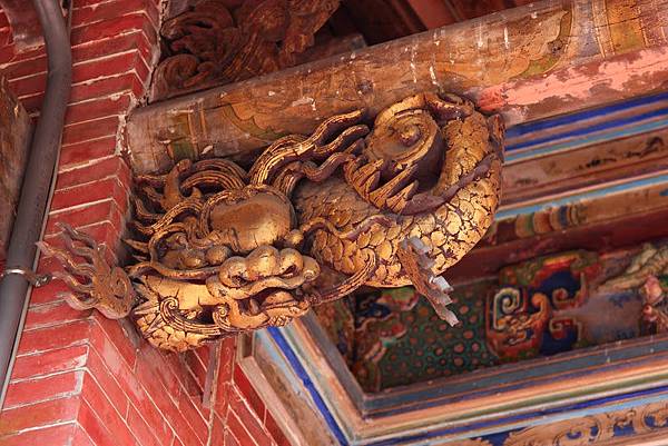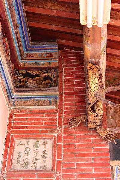 在左右兩側護龍廂房屋架上的「斗抱」上頭雕以螃蟹,即所謂的「二甲傳臚」(甲象徵科甲,科舉第二類稱為二甲),有科舉中第,求得功名之意。