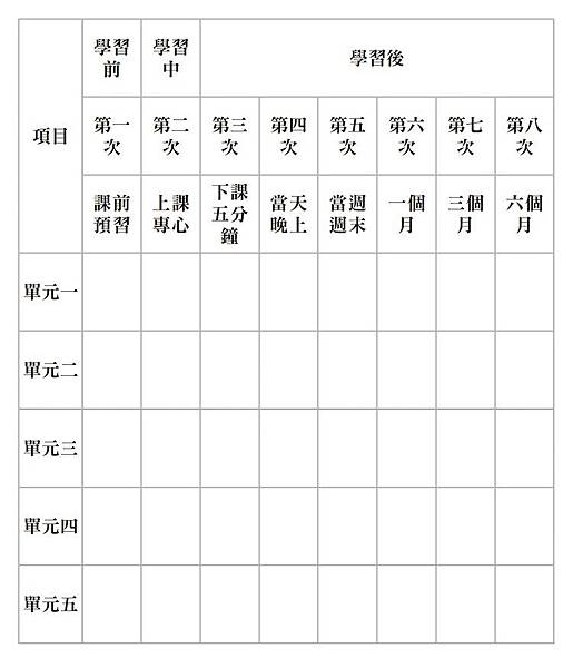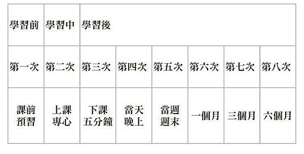 從上述這張表格來看,我們會發現學習後花的次數最多,但是如果算對於素材熟悉的時間,會發現每一次複習所需要花費的時間都在降低當中。因為剛開始我們對於素材內容一定是相對陌生的,透過快速熟悉內容而讓自己理解,理解之後可以把內容蓋起來用自己的話講出來,如果講得卡卡的,那就是不熟悉。如果講得很順且回憶良好,就表示自己已經對於內容有了相當的理解,就可以快速複習完。