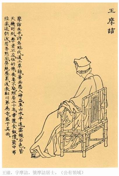王維(公元700─761)字摩詰,盛唐大詩人、大畫家兼音樂家。其詩體物精微,狀寫傳神,清新脫俗,獨成一家。他和李頎、高適、岑參以及王昌齡一起合稱 「王李高岑」,是邊塞詩的代表人物;和孟浩然合稱「王孟」,又是田園詩的代表人物。至於「禪詩」,他更是古今獨步。蘇軾稱他「詩中有畫,畫中有詩」。
