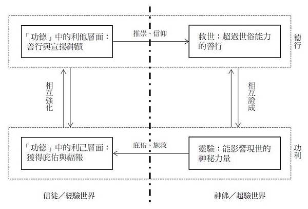 以龍發堂的宗教觀念來說,救治不癒病人的能力,證明了釋開豐在超驗的神佛世界所具有的靈驗力量,也是釋開豐慈悲為懷的道德價值的體現。龍發堂的信仰中超驗力量的發生邏輯,因此乃是奠基於「無私奉獻的崇高德性」與「靈驗的奇蹟事件」之間的相互證成關係,而信徒對於釋開豐神力的信仰與投入慈善行動的動機,則是一種同時提倡無私助人,也期待獲得宗教領袖神蹟庇佑的「功德福報」價值觀(如下圖)。這種在信仰目的上同時具有利己與利他特質的雙重性,在丁仁傑(1999)對慈濟功德會成員的研究中也有類似的發現。