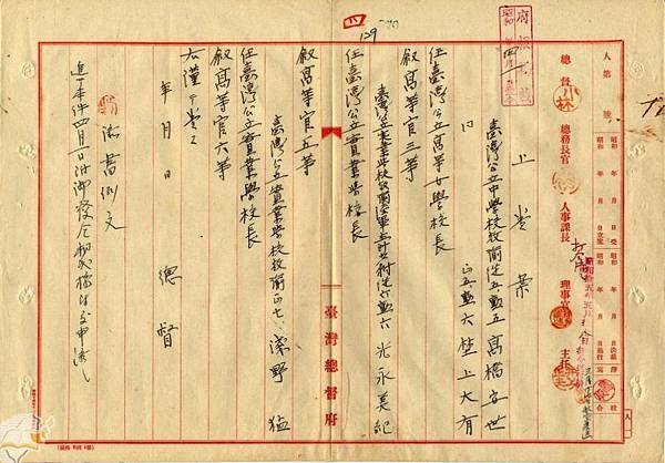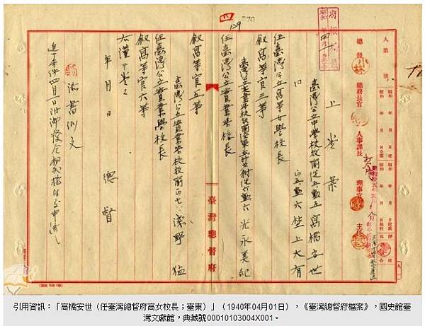 引用資訊:「高橋安世(任臺灣總督府高女校長;臺東)」(1940年04月01日),《臺灣總督府檔案》,國史館臺灣文獻館,典藏號00010103004X001。