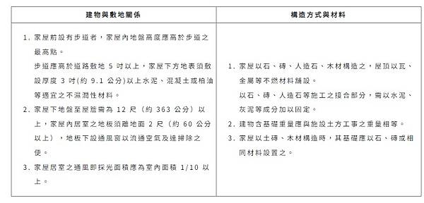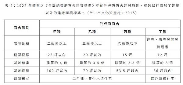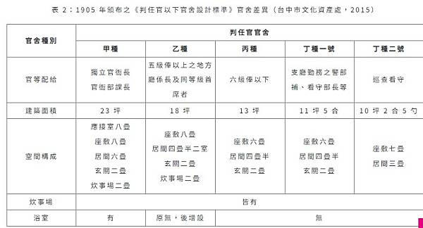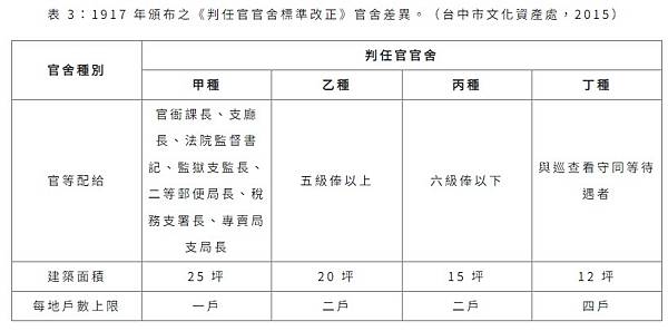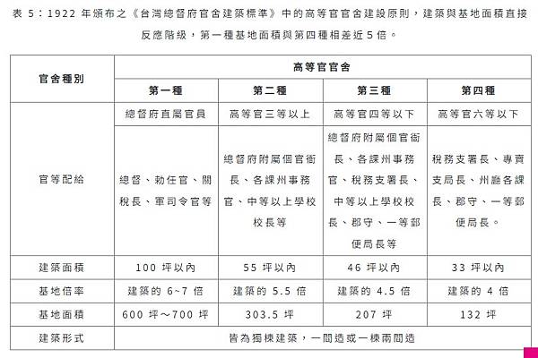 1922年總督府發佈「台灣總督府官舍建築標準」,根據官舍建築標準所訂定的內容,我們可以清楚的知道,當時總督府對於日式宿舍的分配依據官等的大小是有一定的類型規定,反應在建築的面積、敷地與建築類型上。宿舍分八等級分配[1],每一等級所分配皆不同。建築型態分為高等官舍第一到第四種為獨棟建築(一間造或一棟兩間造),判任官舍甲種到丙種為二戶合併建築(雙併式木造),判任官舍丁種為四戶合併住宅,其中,高等官舍為一間造或一棟兩間造,而判任官官舍為一棟數間之長屋式。其詳細坪數及大小內容如表3-3-1所列: