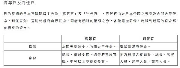 而由日據時期的官制,我們可以看出當時台灣領導階級的層級關係,最高等級的官員即是屬於親任式敘任官的台灣總督,相當於日本國內的總理大臣、外務大臣階級。除親任式敘任官外,高等官分為九等: