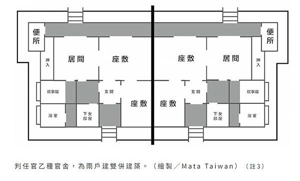 最低的階級即是判任官丁種宿舍,建築坪數只有12坪,基地為建築面積3倍,即36坪左右。由巡查、看所同級待遇官,相當五等判任官居住。