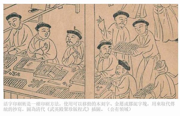 活字印刷術是一種印刷方法,使用可以移動的木刻字、金屬或膠泥字塊,用來取代傳統的抄寫,圖為清代《武英殿聚珍版程式》插圖。(公有領域)