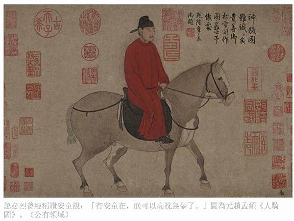 忽必烈曾經稱讚安童說:「有安童在,朕可以高枕無憂了。」圖為元趙孟頫《人騎圖》。(公有領域)