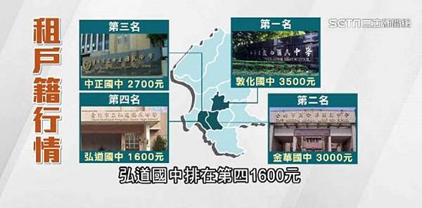 以台北市熱門國中來舉例,租戶籍行情價排行,第一名敦化國中3500元,金華國中排第二3000元,中正國中排在第三2700元,弘道國中排在第四 1600元。