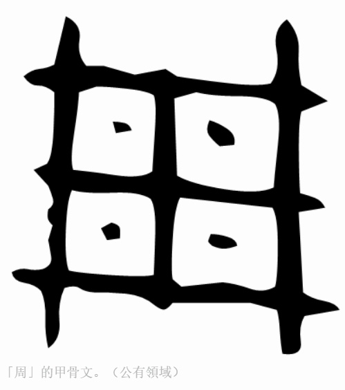 甲骨文周字,形狀是田中有米。殷商時期,周族所在地世代都是產米的地區。在甲骨文中,有殷周互相交通的記載。商王武丁早年,曾到渭水一帶,周人向商王朝貢,並且周人的質子也前往殷商服事君主。周武王姬發滅商以後,便以「周」作為國號。
