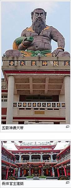 新屋區長祥宮,有一座手持稻穗的神農大帝像,是目前全台灣最高的神農大帝青銅像,於民國82年(西元1993年)鑄造完成。信眾們共籌募四千萬元,以青銅六十五噸、鍍鋅鐵七十五噸,打造了這座高二十公尺的神農大青銅像。加上底座三層樓高的「新屋老人會館」,整座神農大帝青銅像總高度達到三十六公尺[2]。
