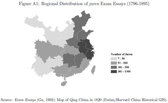 文章使用的數據主要來源於《清代硃卷集成》和《明清進士題名碑錄索引》。前者包含了4035位通過鄉試的舉人履歷信息,記錄了這些舉人鄉試的名次、中舉年齡、父系和母系的上三代特徵信息。這4305個舉人占同時期舉人總數的8%。後者記錄了明清時期所有通過會試得到進士功名的應試者。作者將這兩個數據匹配起來,從而能夠得知《清代硃卷集成》中的哪些舉人通過了進士考試,而且還能知曉這些舉人在殿試中的排名和錄取等級。作者將是否考中進士、殿試的排名和錄取等級作為考察舉人是否獲得向上流動這一因變量的三個度量指標。
