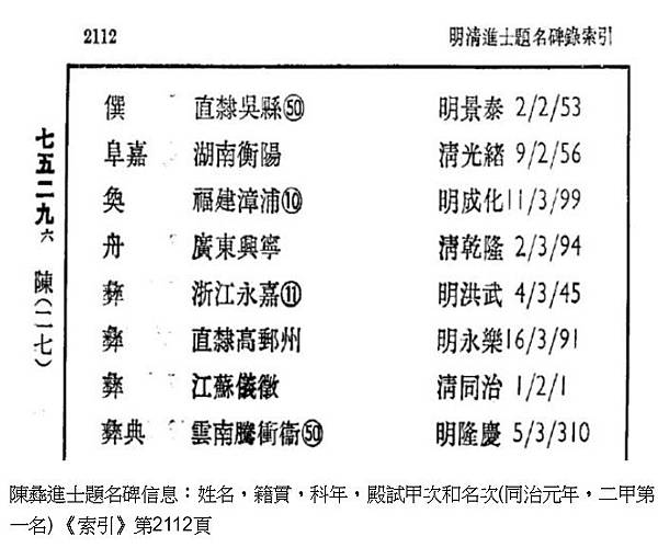 陳彝進士題名碑信息:姓名,籍貫,科年,殿試甲次和名次(同治元年,二甲第一名) 《索引》第2112頁