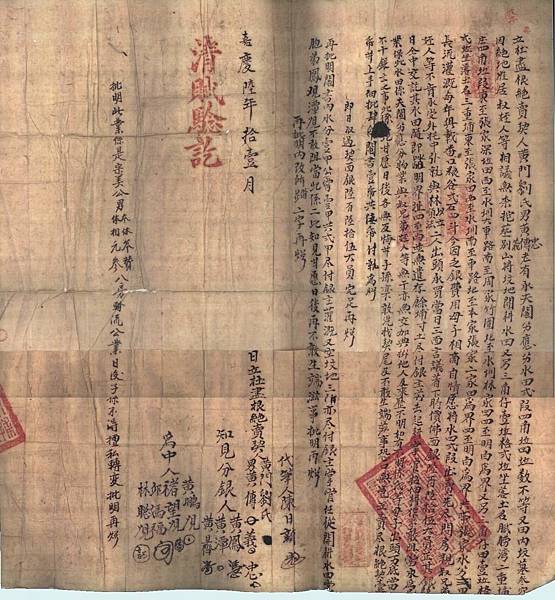 仝立鬮分字人:兄弟石泉、阿滿,侄阿和等。為祖父承下並無田園、散(產)業,創有種物己(幾)件。兄弟叔侄嘗(商)議,不以(如)今日和氣,免至日後爭長;特請房族人等到家,將物件等項作為參分均分,各此物件憑鬮所拈,各拈鬮份,各此守管。此係兄弟叔侄等心甘意喜,日後不異言反悔,又不得爭長兢短。此分居移(以)後,房房富貴、福祿榮長。批炤。恐怕口說無憑,今立有憑字參紙壹養(樣),各執壹紙,付執永炤。