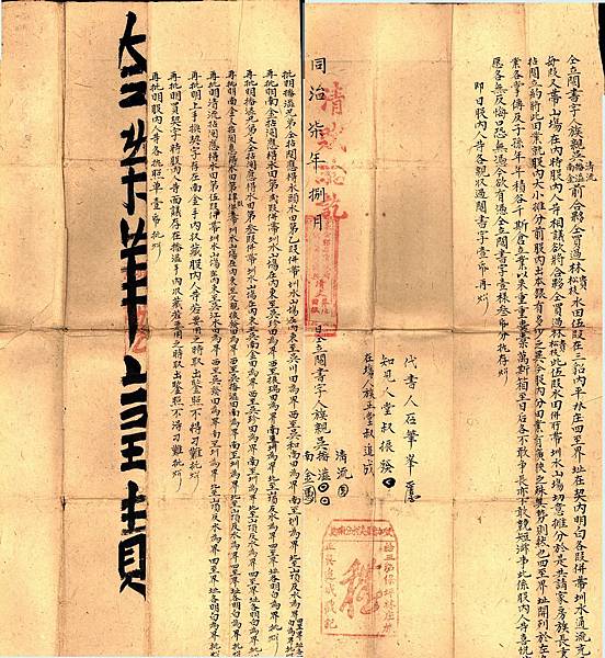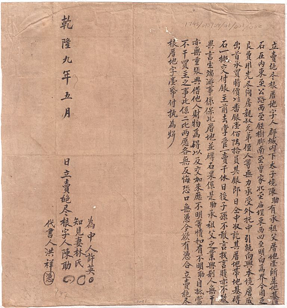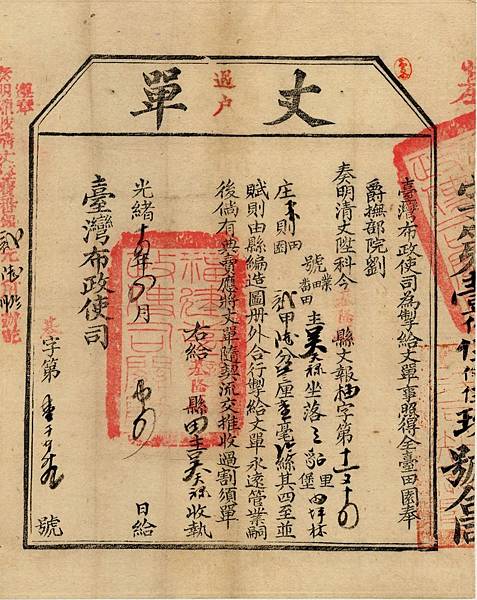 印章戳記,包括指掌印、畫押、簽名、戳記及官印等(圖3),這些印記是契約文書的重要組成部分,責任者在文書的某個部位鈐蓋印章或簽字畫押,作為文件生效的標誌。因此,在描述此類檔案時,可考慮著錄印記相關資料,簡要層級的描述可僅紀錄枚數,若詳盡層級之描述,則可著錄其位置、顏色、形制及印文內容等資訊。在前述典藏古地契的單位中,逢甲大學便有著錄印章之枚數;中央研究院臺灣史研究所檔案館則以著錄印章(關防、官印、私人印章或其他)為主;宜蘭縣史館在其典藏管理之基本資料表中,有印記說明的欄位,包括畫押、簽名、官印、戳記、指印、掌印、腳印等