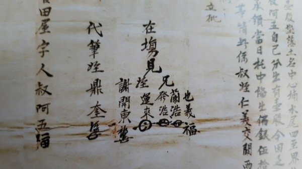 黃學堂說,大家都聽過古代有「畫押」,但未見過什麼叫畫押,一份清光緒19年的土地買賣契約,因當時大家都不識字,由代筆人撰寫後代為簽名,見證人各在自己名字下隨便畫,沒有特別形體,但這就是所謂的「畫押」了,效力等同親筆簽名。