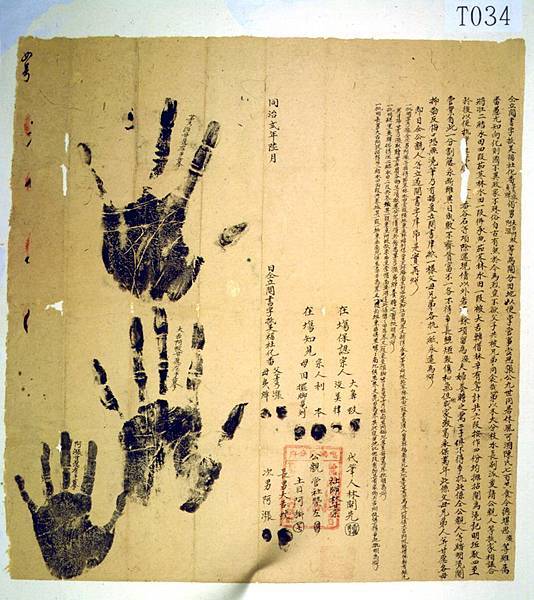 古書契又稱「古文書」兩個大的黑色左手印,手印裡寫著「福手印甘愿」及「祿甘愿手印」,立契人是被稱為「白番」的阿福與阿祿兩人。https://goo.gl/9K48LE