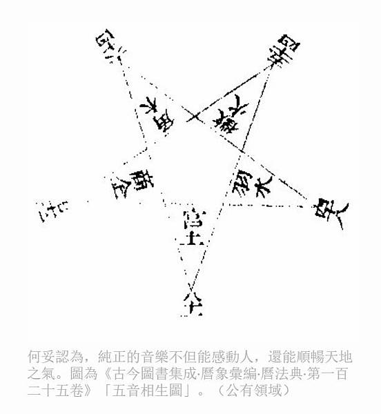 何妥認為,純正的音樂不但能感動人,還能順暢天地之氣。圖為《古今圖書集成‧曆象彙編‧曆法典‧第一百二十五卷》「五音相生圖」。(公有領域)