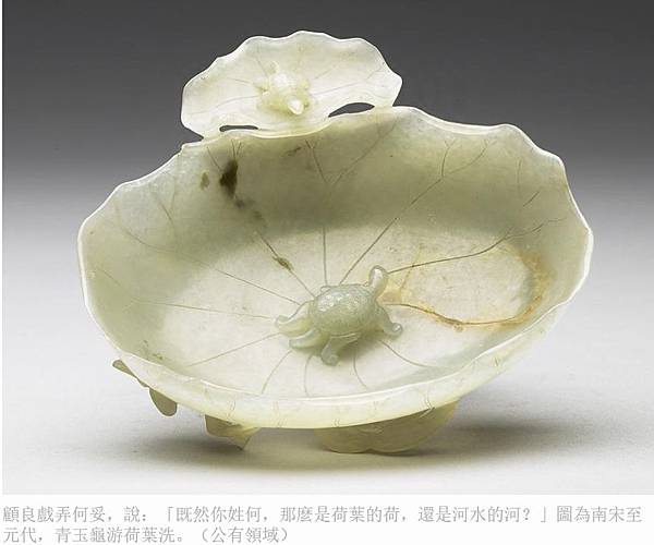 顧良戲弄何妥,說:「既然你姓何,那麼是荷葉的荷,還是河水的河?」圖為南宋至元代,青玉龜游荷葉洗。(公有領域)