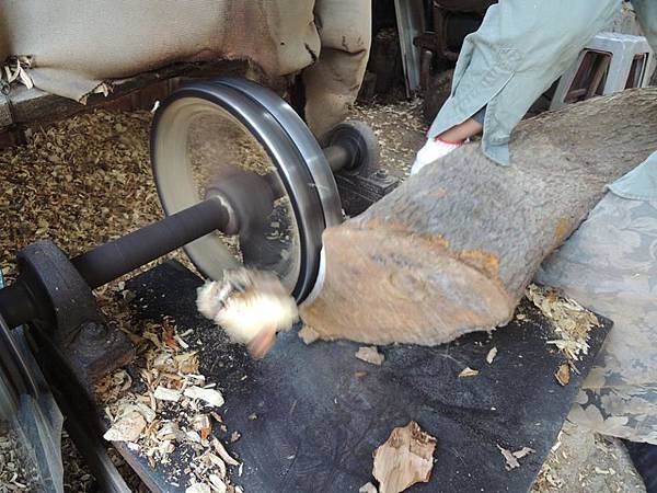 在焗腦之前先要將樟樹以切削機將樟樹的枝幹切削成約一寸左右大小的小碎片,這個作業在未使用切削機之前,可是要以人力用斧頭慢慢進行切削的動作,自然非常的辛苦,尤其是遇到大樹幹時。等收集到足夠一鍋的數量,然後進行裝爐的工作。
