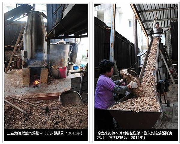 提煉樟腦的樟樹分為香樟和芳樟,香樟氣味清香,頗受消費者喜愛,可提煉出樟腦砂(樟腦油的結晶),但不能和芳樟一起熬煮。樹幹的碎片得熬煮七至八小時,若是熬煮樹根和樹頭,得熬煮十小時,但油質較多。一千斤的香樟中只摻雜五斤的芳樟,樟腦砂就會融化掉,所以香樟和芳樟必須分開熬煮。