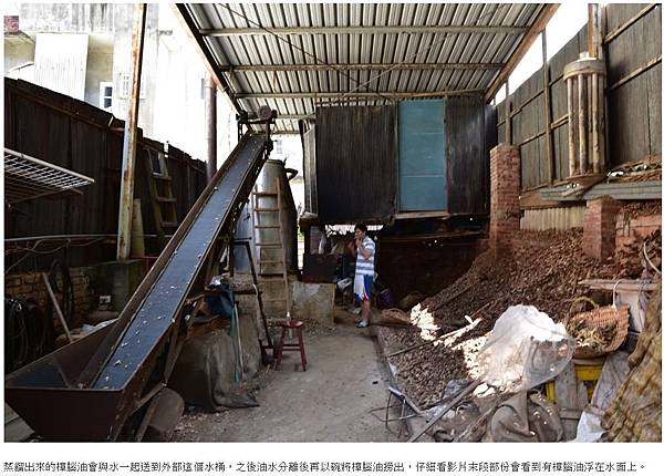蒸餾出來的氣體由爐上方的管線流經冷卻器,將氣體冷郤成混合液體,再經過分離器將樟腦油及水分離,然後裝瓶而成為成品。這時才算大功告成。等爐體冷郤後,再打開爐體下方的側門,將爐內的碎片清出,等待下一次的操作。