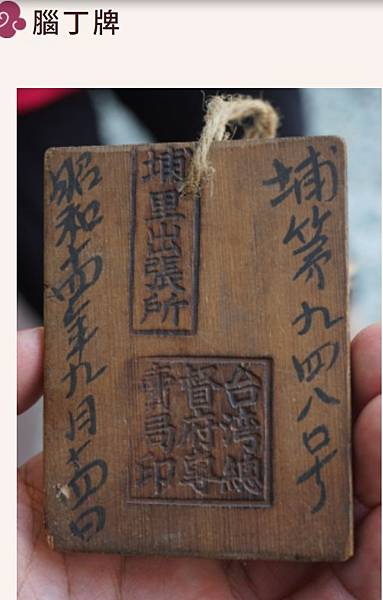 簡單敘述: 腦丁是指採樟焗腦的工人,日本時期樟腦成為專賣,從事探樟焗腦的工人必須有專賣局核發的「腦丁牌」才能擔任腦丁及進出山區。招雇腦丁是需配合腦灶設備及原料採伐之難易而定,多則浪費,少則影響生產工作。經過腦丁(焗腦工人)考試,拿到腦丁牌的人可以不用當兵,享有比一般的平民更好的待遇。 王德福(日昭和16年/1941)的祖父輩從新竹關西搬到南湖村,當時只能做一些雜工維生,後來到父親時便開始入山開樟焗腦,王德福也繼承父親的工作,一直從年輕做到結婚後。當時採樟的地點在部份在大甲林區南坑,也就是現在臺中市和平區的梅園、天狗部落。 王德福表示:當時的採伐工人叫「腦丁」,身上或扁擔上都要掛一只用繩子串著的四吋左右的腦丁木牌,上面寫著:「名字、林區、出張所」,不然是不可以隨便進入林區的。 多年的採樟經驗,王德福很容易就可以在大片的樟樹林間找到最好的樟樹來焗腦。他表示:樟樹有很多種,大約可分為:芳樟及本樟。芳樟有臭味,但是沒有腦砂,可以做化妝品使用。本樟有香氣,可以提煉腦砂,油份也較多。 王德福自已原本也有一張腦丁牌,後來借給東勢客家文化園區的朋友展覽時弄丟了,目前手上的這張腦丁牌是另一朋友給他的。腦丁牌是木質,長9公分、寬6.8公分、高1公分。