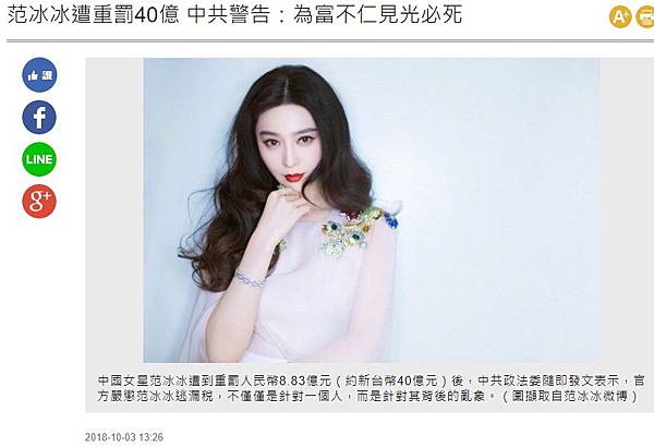 分享范冰冰遭重罰40億 中共警告:為富不仁見光必死到Facebook 分享范冰冰遭重罰40億 中共警告:為富不仁見光必死到Line 分享范冰冰遭重罰40億 中共警告:為富不仁見光必死到Google+