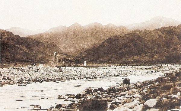-日本時代的上坪溪及吊橋,溪邊還有水牛駐足