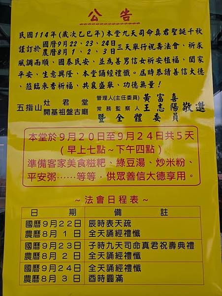 五指山灶君堂管理委員會表示,國曆9月22日、農曆8月初3是灶君堂主神九天司命真君、灶君爺的聖誕,廟方依傳統舉辦「灶君生」法會為灶君爺祝壽,祝壽大典訂於22日凌晨0點到2點舉行,歡迎各界踴躍參加。