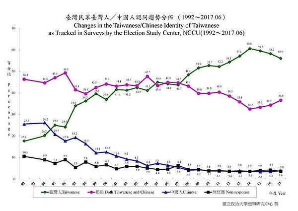 台灣人認同(排他性的認同,exclusive identity)在2014年達到高峰,六成(60.6%)的民眾認為自己是台灣人,而不是中國人,也不是「都是」。然而,在2014年之後的幾次調查,這個比例呈現微幅下降,從60.6%下降到2017年六月時的56%,回答「都是」的比例則是止跌回升,從2014年的低點32.5%上升到36.6%