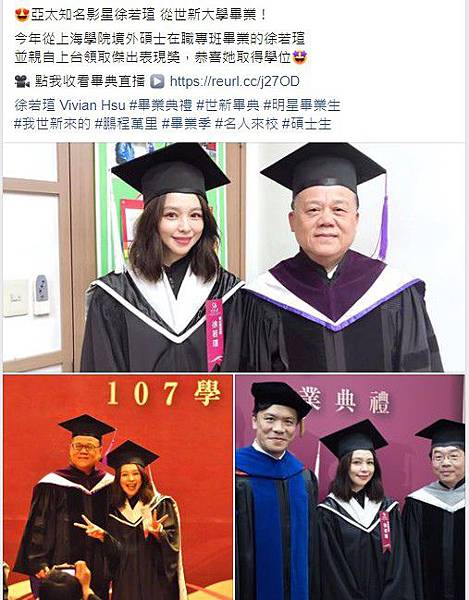 據了解,徐若瑄去年6月於臉書宣布從世新大學上海碩專班畢業,並侃侃而談自己的求學過程,「曾經一度因為事業、家庭兩頭燒,及住的太遠等原因,累的快撐不下去,但感謝院長一直不放棄的鼓勵、家人和同學們的支持,才終於能走到這天」,文末更感性寫下:「希望徐老爹在天之靈,也能以我為榮」。
