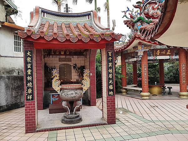 廟埕、伯公殿、拜亭、供桌、伯公香爐、天公爐、有應公香爐、燒金銀紙的金爐。