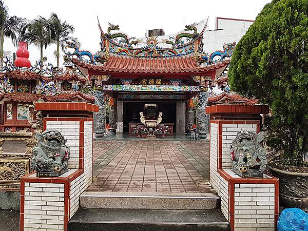 廟前有兩隻石獅子,守護著伯公伯婆。周邊圍牆有很多磁貼,有雙龍搶珠、八仙子、福祿壽三仙、文王托車、人物加坐騎及各種花鳥植物的吉祥圖案,鮮豔華麗。