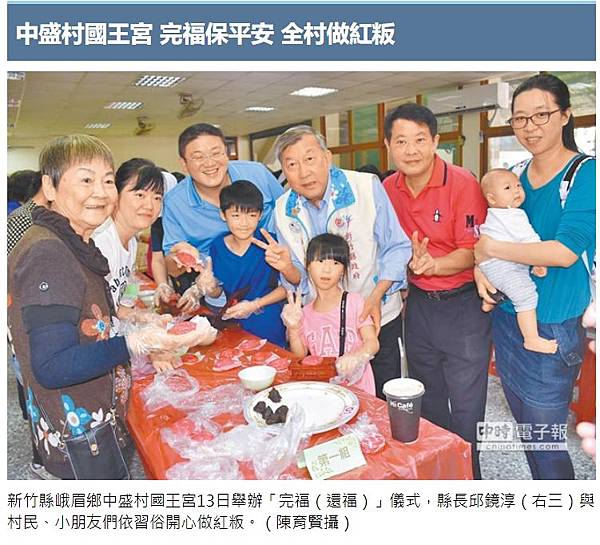 新竹縣峨眉鄉中盛村國王宮,在每年農曆的10月15日都會遵循傳統民俗舉辦「完福(還福)」儀式,縣長邱鏡淳13日特別與村民及小朋友們依習俗做紅粄到廟裡拜拜,感謝神明一年來保佑闔家平安,也讓親子們增進情感。