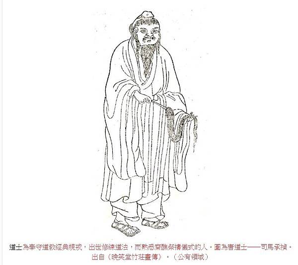 道士為奉守道教經典規戒,出世修練道法,而熟悉齋醮祭禱儀式的人。圖為唐道士──司馬承禎。出自《晩笑堂竹荘畫傳》。(公有領域)