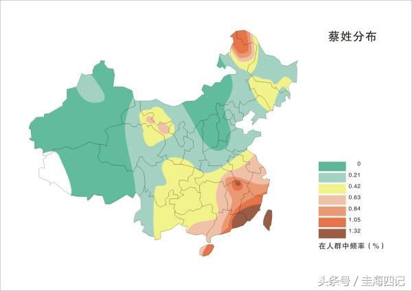 蔡姓在全國的分布,主要集中於廣東、福建和台灣三省,是典型的閩南姓氏。閩南蔡氏以濟陽為總堂號,源出有二,一為隨陳元光入閩平蠻的開漳派蔡彧(字德明)、蔡長眉(字德軒)兄弟,二為隨王審知開閩的蔡用元、蔡用明兄弟,兩個時期四個支脈都可追溯至同一地源,河南光州固始縣,今河南信陽市固始縣。