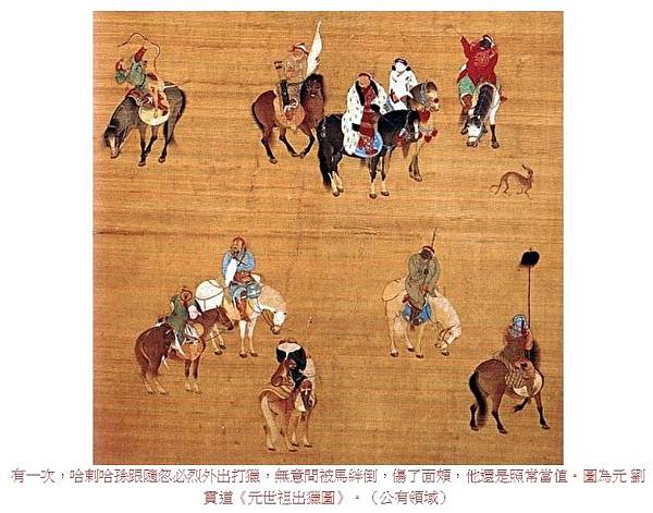 有一次,哈剌哈孫跟隨忽必烈外出打獵,無意間被馬絆倒,傷了面頰,他還是照常當值。圖為元 劉貫道《元世祖出獵圖》。(公有領域)